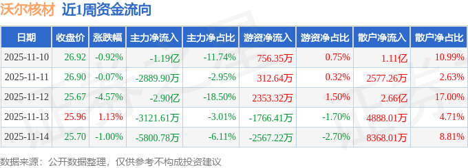 资金流向数据方面,本周沃尔核材主力资金合计净流出5.27亿元,游资资金合计净流出911.31万元,散户资金合计净流入5.36亿元。本周资金流向一览见下表: