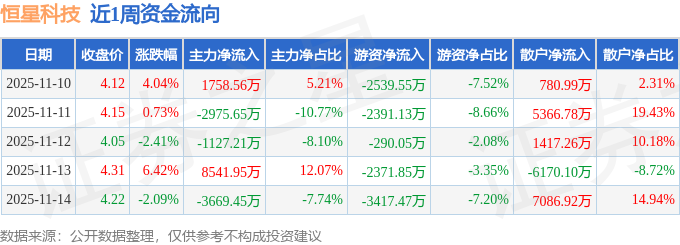 资金流向数据方面,本周恒星科技主力资金合计净流入2528.2万元,游资资金合计净流出1.1亿元,散户资金合计净流入8481.85万元。本周资金流向一览见下表:
