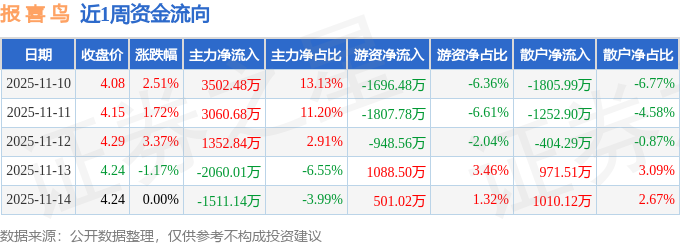 资金流向数据方面,本周报 喜 鸟主力资金合计净流入4344.85万元,游资资金合计净流出2863.3万元,散户资金合计净流出1481.56万元。本周资金流向一览见下表: