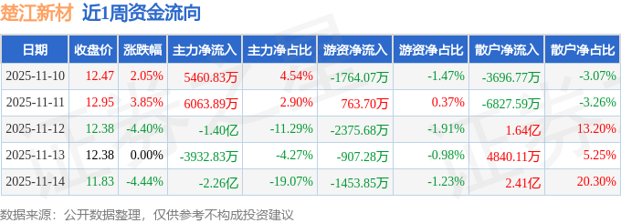 资金流向数据方面,本周楚江新材主力资金合计净流出2.91亿元,游资资金合计净流出5737.16万元,散户资金合计净流入3.48亿元。本周资金流向一览见下表: