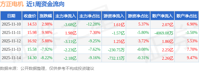 资金流向数据方面,本周方正电机主力资金合计净流出9.22亿元,游资资金合计净流入1.19亿元,散户资金合计净流入8.03亿元。本周资金流向一览见下表: