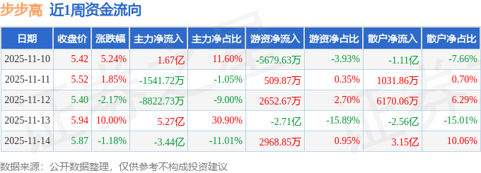 资金流向数据方面,本周步步高主力资金合计净流入2.46亿元,游资资金合计净流出2.66亿元,散户资金合计净流入2021.44万元。本周资金流向一览见下表: