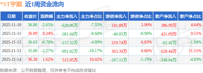 资金流向数据方面,本周*ST宇顺主力资金合计净流出1643.1万元,游资资金合计净流入517.84万元,散户资金合计净流入1125.25万元。本周资金流向一览见下表: