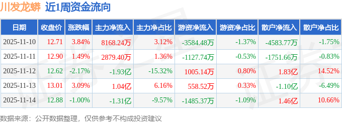 资金流向数据方面,本周川发龙蟒主力资金合计净流出1.09亿元,游资资金合计净流出4633.93万元,散户资金合计净流入1.55亿元。本周资金流向一览见下表:
