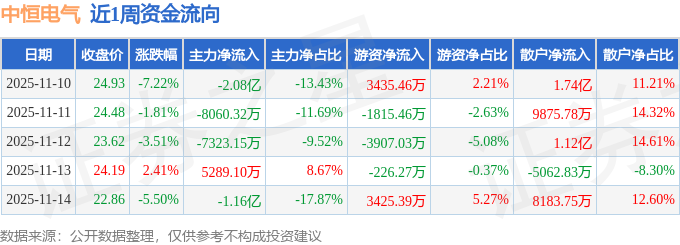 资金流向数据方面,本周中恒电气主力资金合计净流出4.25亿元,游资资金合计净流入912.09万元,散户资金合计净流入4.16亿元。本周资金流向一览见下表: