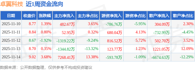资金流向数据方面,本周卓翼科技主力资金合计净流入5140.0万元,游资资金合计净流入239.79万元,散户资金合计净流出5379.79万元。本周资金流向一览见下表: