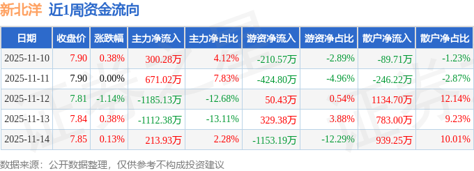 资金流向数据方面,本周新北洋主力资金合计净流出1112.27万元,游资资金合计净流出1408.76万元,散户资金合计净流入2521.03万元。本周资金流向一览见下表: