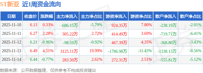 资金流向数据方面,本周ST新亚主力资金合计净流入2929.09万元,游资资金合计净流入291.55万元,散户资金合计净流出3220.64万元。本周资金流向一览见下表: