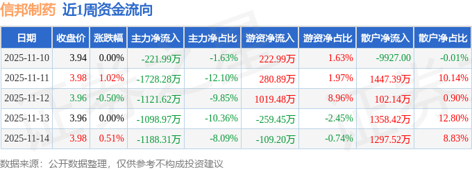资金流向数据方面,本周信邦制药主力资金合计净流出5359.18万元,游资资金合计净流入1154.71万元,散户资金合计净流入4204.48万元。本周资金流向一览见下表: