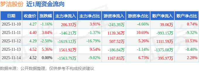 资金流向数据方面,本周梦洁股份主力资金合计净流出1560.87万元,游资资金合计净流入2382.48万元,散户资金合计净流出821.61万元。本周资金流向一览见下表: