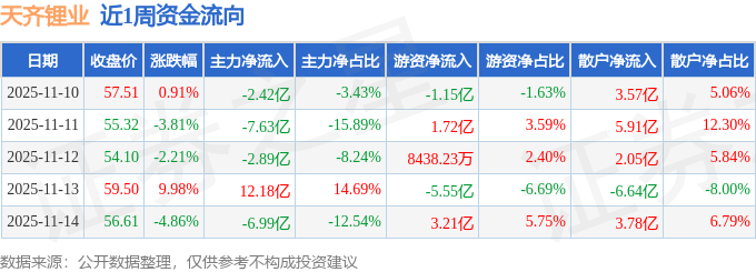 资金流向数据方面,本周天齐锂业主力资金合计净流出7.75亿元,游资资金合计净流出9272.82万元,散户资金合计净流入8.67亿元。本周资金流向一览见下表: