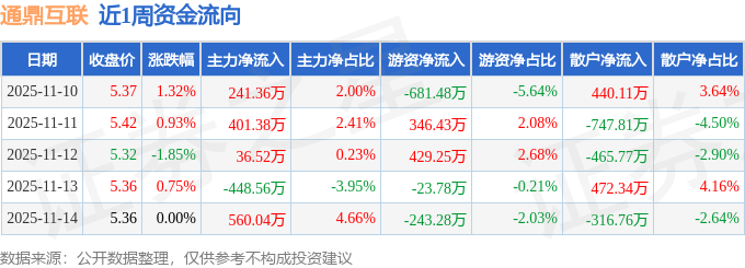 资金流向数据方面,本周通鼎互联主力资金合计净流入790.75万元,游资资金合计净流出172.86万元,散户资金合计净流出617.89万元。本周资金流向一览见下表: