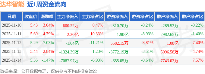 资金流向数据方面,本周达华智能主力资金合计净流出2213.62万元,游资资金合计净流出1.82亿元,散户资金合计净流入2.04亿元。本周资金流向一览见下表: