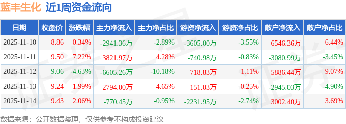 资金流向数据方面,本周蓝丰生化主力资金合计净流出3701.1万元,游资资金合计净流出5708.08万元,散户资金合计净流入9409.18万元。本周资金流向一览见下表: