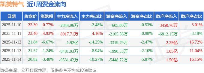 资金流向数据方面,本周凯美特气主力资金合计净流出3.11亿元,游资资金合计净流出1.35亿元,散户资金合计净流入4.46亿元。本周资金流向一览见下表: