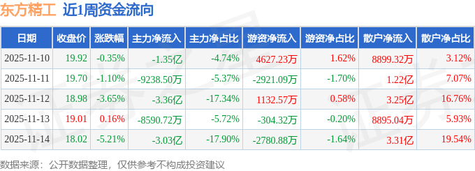 资金流向数据方面,本周东方精工主力资金合计净流出9.53亿元,游资资金合计净流出246.49万元,散户资金合计净流入9.55亿元。本周资金流向一览见下表:
