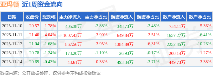 资金流向数据方面,本周亚玛顿主力资金合计净流入1340.01万元,游资资金合计净流入1165.73万元,散户资金合计净流出2505.74万元。本周资金流向一览见下表: