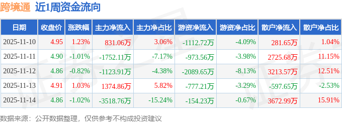 资金流向数据方面,本周跨境通主力资金合计净流出4188.86万元,游资资金合计净流出5107.38万元,散户资金合计净流入9296.24万元。本周资金流向一览见下表: