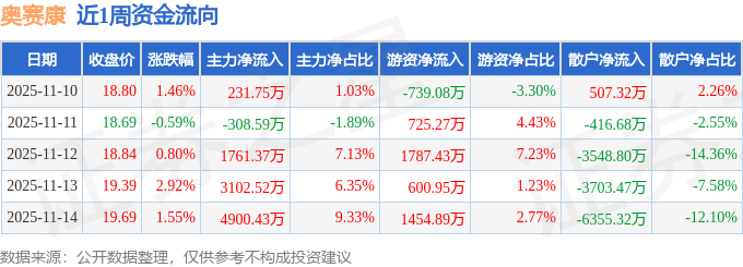 资金流向数据方面,本周奥赛康主力资金合计净流入9687.48万元,游资资金合计净流入3829.46万元,散户资金合计净流出1.35亿元。本周资金流向一览见下表: