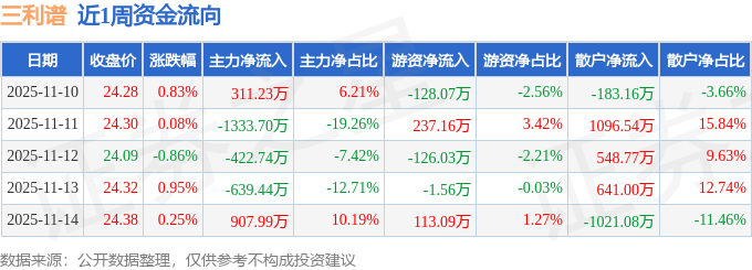 资金流向数据方面,本周三利谱主力资金合计净流出1176.66万元,游资资金合计净流入94.59万元,散户资金合计净流入1082.07万元。本周资金流向一览见下表: