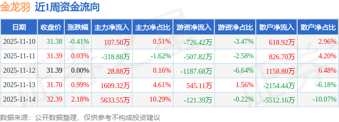 资金流向数据方面,本周金龙羽主力资金合计净流入7060.38万元,游资资金合计净流出1998.2万元,散户资金合计净流出5062.18万元。本周资金流向一览见下表: