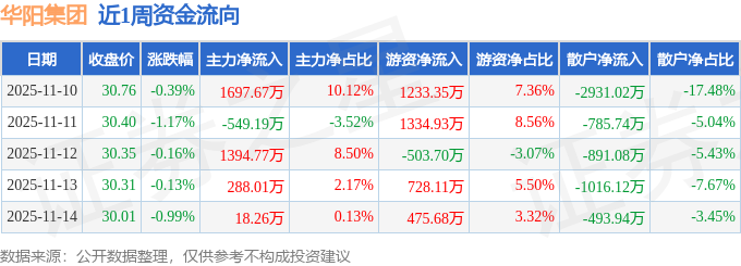 资金流向数据方面,本周华阳集团主力资金合计净流入2849.53万元,游资资金合计净流入3268.37万元,散户资金合计净流出6117.9万元。本周资金流向一览见下表: