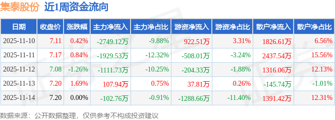资金流向数据方面,本周集泰股份主力资金合计净流出5785.2万元,游资资金合计净流出1040.68万元,散户资金合计净流入6825.88万元。本周资金流向一览见下表:
