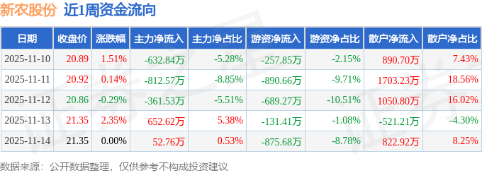 资金流向数据方面,本周新农股份主力资金合计净流出1101.55万元,游资资金合计净流出2844.88万元,散户资金合计净流入3946.43万元。本周资金流向一览见下表:
