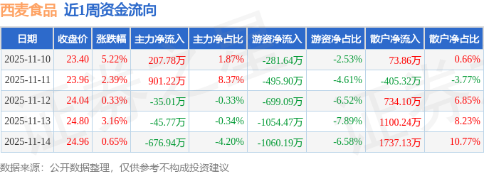 资金流向数据方面,本周西麦食品主力资金合计净流入351.28万元,游资资金合计净流出3591.29万元,散户资金合计净流入3240.01万元。本周资金流向一览见下表: