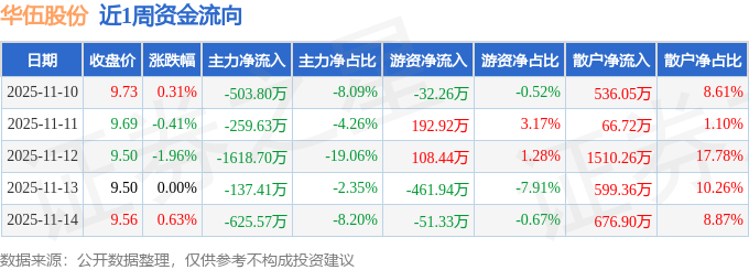 资金流向数据方面,本周华伍股份主力资金合计净流出3145.11万元,游资资金合计净流出244.17万元,散户资金合计净流入3389.28万元。本周资金流向一览见下表: