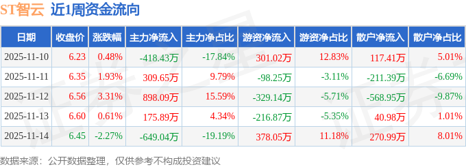 资金流向数据方面,本周ST智云主力资金合计净流入316.16万元,游资资金合计净流入34.81万元,散户资金合计净流出350.97万元。本周资金流向一览见下表: