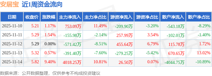 资金流向数据方面,本周安居宝主力资金合计净流入3652.55万元,游资资金合计净流入250.98万元,散户资金合计净流出3903.52万元。本周资金流向一览见下表: