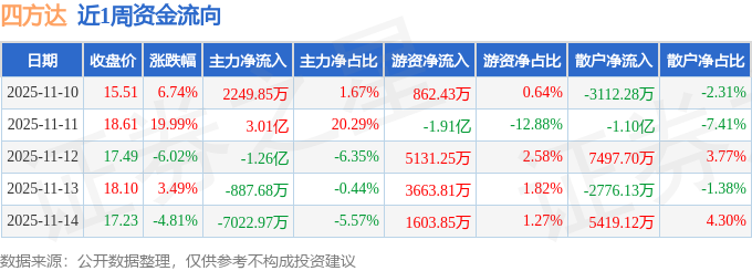 资金流向数据方面,本周四方达主力资金合计净流入1.18亿元,游资资金合计净流出7826.52万元,散户资金合计净流出3949.97万元。本周资金流向一览见下表: