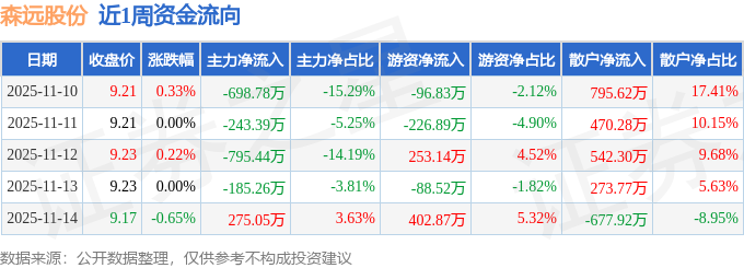 资金流向数据方面,本周森远股份主力资金合计净流出1647.83万元,游资资金合计净流入243.78万元,散户资金合计净流入1404.06万元。本周资金流向一览见下表: