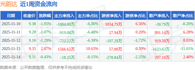 资金流向数据方面,本周光韵达主力资金合计净流出1096.93万元,游资资金合计净流入643.61万元,散户资金合计净流入453.33万元。本周资金流向一览见下表: