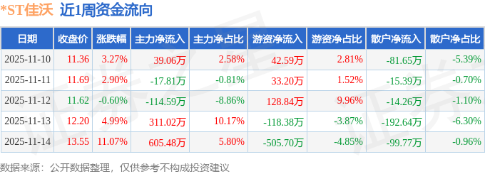 资金流向数据方面,本周*ST佳沃主力资金合计净流入823.16万元,游资资金合计净流出419.45万元,散户资金合计净流出403.71万元。本周资金流向一览见下表: