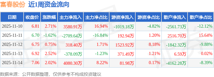 资金流向数据方面,本周富春股份主力资金合计净流入4891.88万元,游资资金合计净流入1151.16万元,散户资金合计净流出6043.04万元。本周资金流向一览见下表: