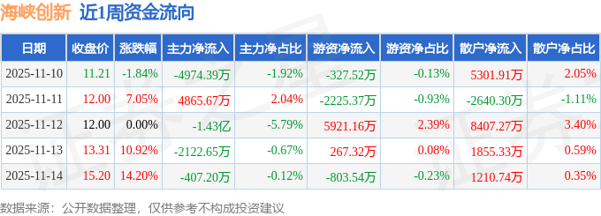 资金流向数据方面,本周海峡创新主力资金合计净流出1.7亿元,游资资金合计净流入2832.06万元,散户资金合计净流入1.41亿元。本周资金流向一览见下表: