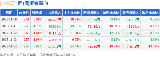 资金流向数据方面,本周ST长方主力资金合计净流出192.54万元,游资资金合计净流入1.66万元,散户资金合计净流入190.88万元。本周资金流向一览见下表: