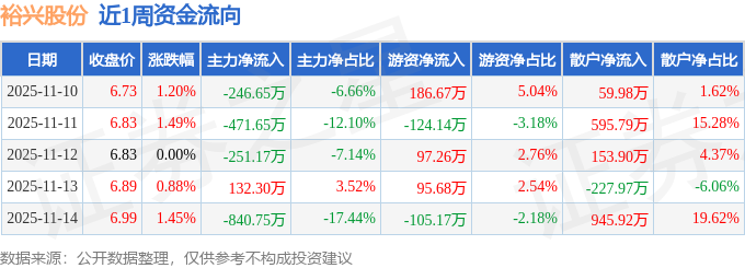 资金流向数据方面,本周裕兴股份主力资金合计净流出1677.91万元,游资资金合计净流入150.3万元,散户资金合计净流入1527.61万元。本周资金流向一览见下表: