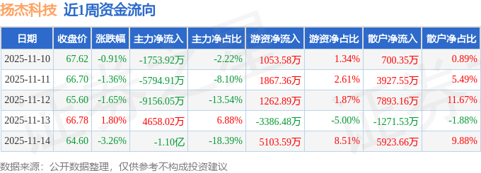 资金流向数据方面,本周扬杰科技主力资金合计净流出2.31亿元,游资资金合计净流入5900.93万元,散户资金合计净流入1.72亿元。本周资金流向一览见下表: