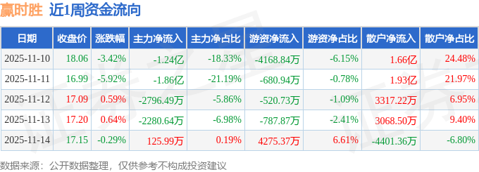 资金流向数据方面,本周赢时胜主力资金合计净流出3.59亿元,游资资金合计净流出1883.0万元,散户资金合计净流入3.78亿元。本周资金流向一览见下表: