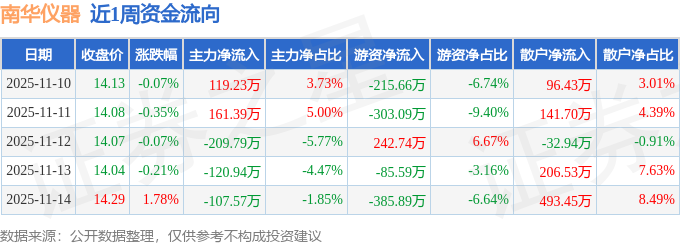 资金流向数据方面,本周南华仪器主力资金合计净流出157.67万元,游资资金合计净流出747.49万元,散户资金合计净流入905.17万元。本周资金流向一览见下表: