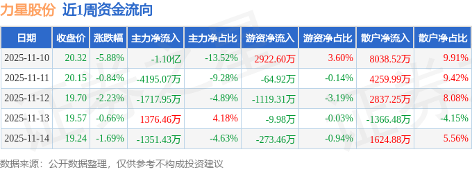 资金流向数据方面,本周力星股份主力资金合计净流出1.68亿元,游资资金合计净流入1454.95万元,散户资金合计净流入1.54亿元。本周资金流向一览见下表: