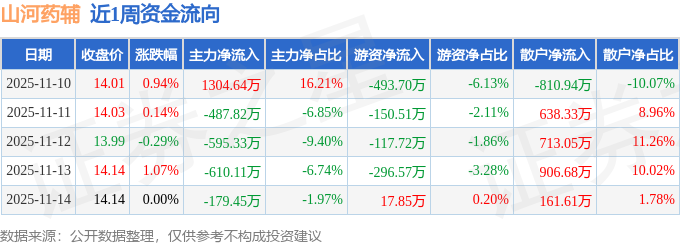 资金流向数据方面,本周山河药辅主力资金合计净流出568.08万元,游资资金合计净流出1040.65万元,散户资金合计净流入1608.73万元。本周资金流向一览见下表: