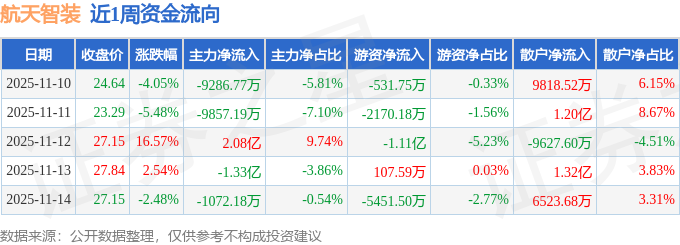 资金流向数据方面,本周航天智装主力资金合计净流出1.27亿元,游资资金合计净流出1.92亿元,散户资金合计净流入3.19亿元。本周资金流向一览见下表: