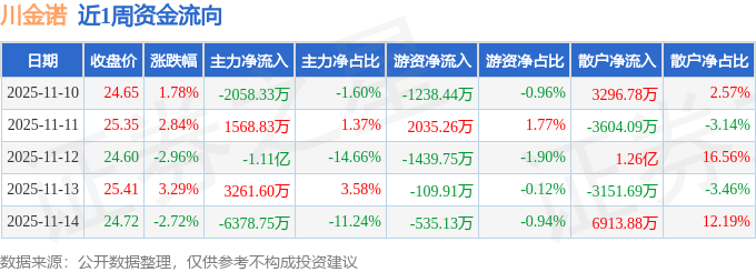资金流向数据方面,本周川金诺主力资金合计净流出1.47亿元,游资资金合计净流出1287.98万元,散户资金合计净流入1.6亿元。本周资金流向一览见下表: