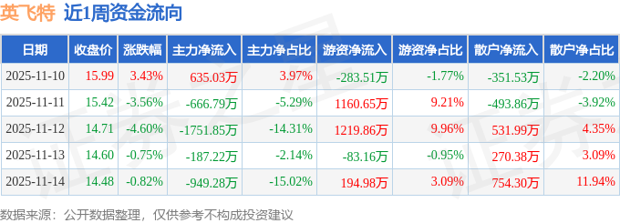 资金流向数据方面,本周英飞特主力资金合计净流出2920.1万元,游资资金合计净流入2208.81万元,散户资金合计净流入711.29万元。本周资金流向一览见下表: