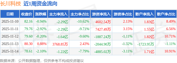 资金流向数据方面,本周长川科技主力资金合计净流出7.06亿元,游资资金合计净流入3212.88万元,散户资金合计净流入6.74亿元。本周资金流向一览见下表:
