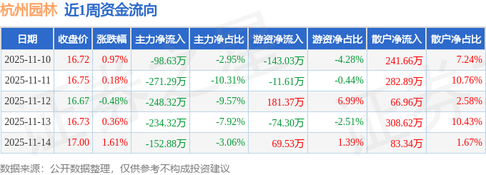 资金流向数据方面,本周杭州园林主力资金合计净流出1005.44万元,游资资金合计净流入21.96万元,散户资金合计净流入983.48万元。本周资金流向一览见下表: